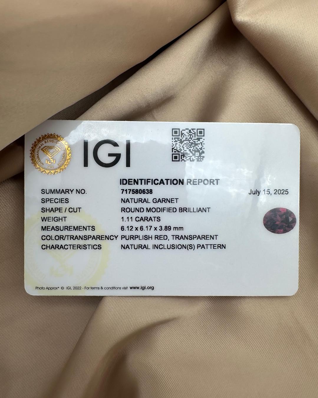 🔹 IGI-certified 100% Natural Garnet, 1.11 ct, round cut