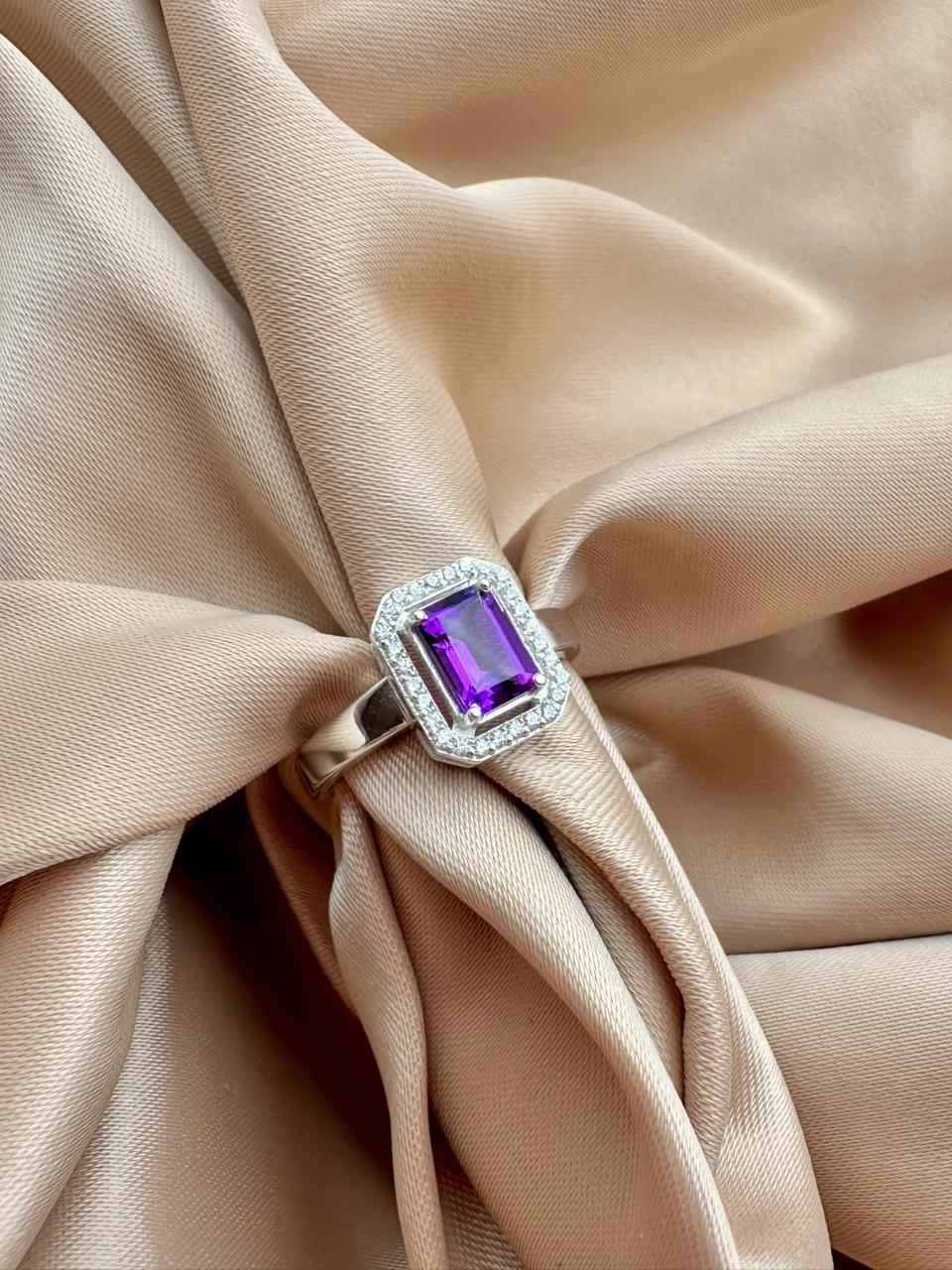 An elegant ring that showcases the deep royal purple brilliance of a natural Amethyst gemstone, beautifully framed by a refined halo of sparkling accent stones. The emerald-cut center stone offers sharp lines and exceptional clarity, creating a bold yet timeless look that stands out with sophisticated presence.