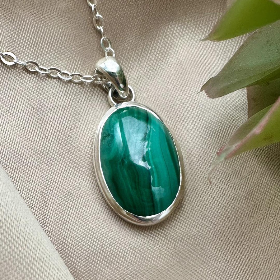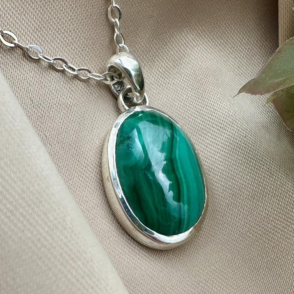 This elegant pendant features a natural Malachite, admired for its rich green color and distinctive banded patterns. A timeless piece that reflects authenticity and refined craftsmanship.