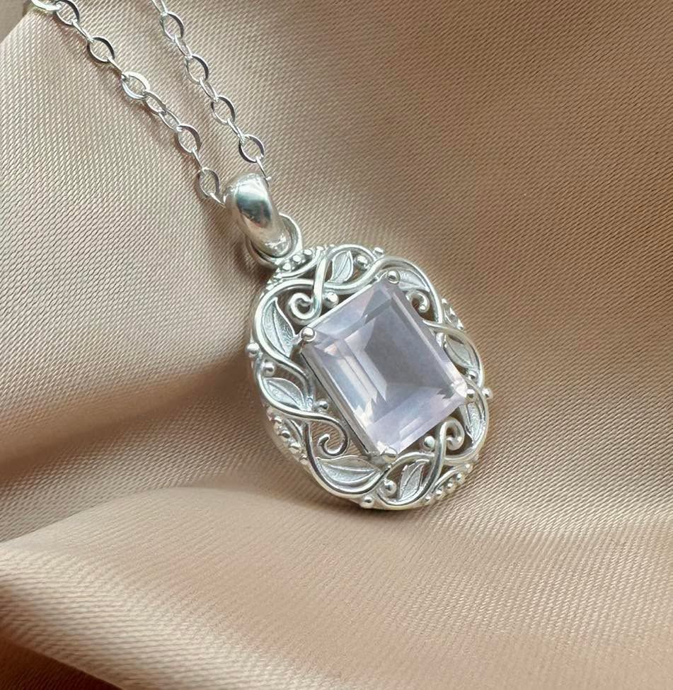 A natural Rose Quartz pendant, glowing with vivid green brilliance. Crafted in 925 Swiss Silver with an artistic leaf-inspired design, this piece blends modern elegance with timeless charm.